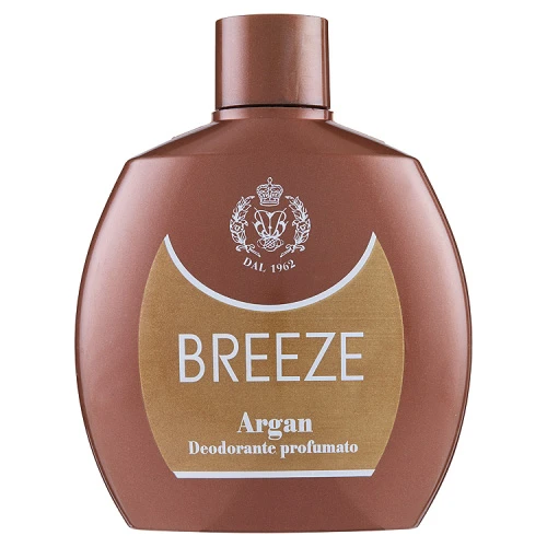 La linea Breeze Squeeze si arricchisce della nuova referenza Argan, estratta dalla preziosa pianta del Marocco, da cui si ricava l’olio dalle riconosciute virtù idratanti ed antiossidanti. La particolare profumazione, dalle note calde ed avvolgenti, assicura freschezza per tutto il giorno. La sua formula è NO GAS e senza sali di alluminio.